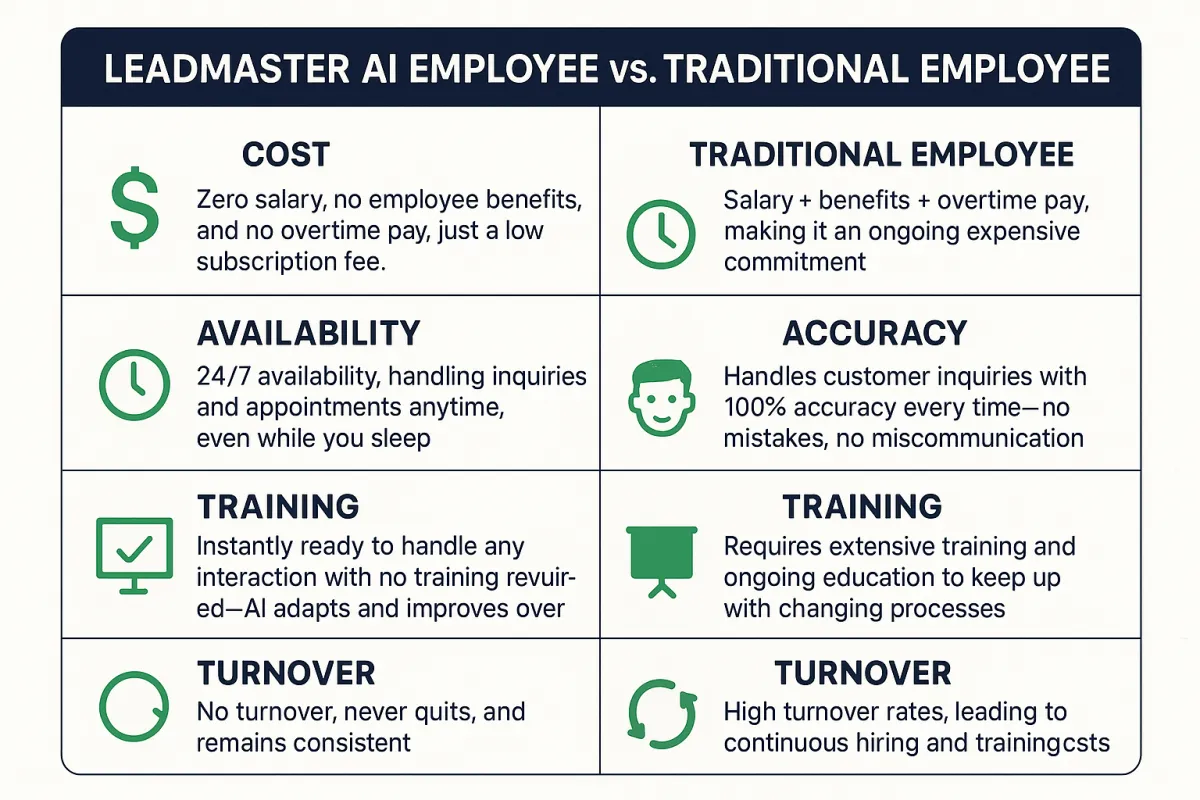Your AI Employee isn’t just an answering bot—it’s a fully automated team member designed to book more appointments, qualify leads, and free up your time to focus on what you do best.